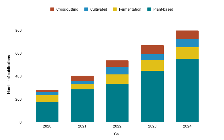 But these surface-level challenges don’t tell the full story. Where private investment has faltered, public investment in science has continued to grow. Our latest reports on the scientific funding and publishing ecosystems revealed that alternative protein research has nearly tripled since 2020, with almost 800 academic papers published in 2024 and public funding increasing from €80 million to over €320 million.