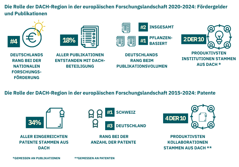 Wie in vielen anderen Regionen ist auch in der DACH-Region die Forschung zu pflanzenbasierten Proteinen derzeit am weitesten entwickelt. Zwischen 2020 und 2024 entfiel über die Hälfte aller wissenschaftlichen Publikationen sowie rund 80 % aller angemeldeten Patente auf pflanzenbasierte Technologien. Einrichtungen wie die Universität Hohenheim, das Fraunhofer-Institut für Verfahrenstechnik und Verpackung (IVV) oder die Technische Universität München zählen zu den aktivsten öffentlichen Forschungseinrichtungen Europas in diesem Bereich.
