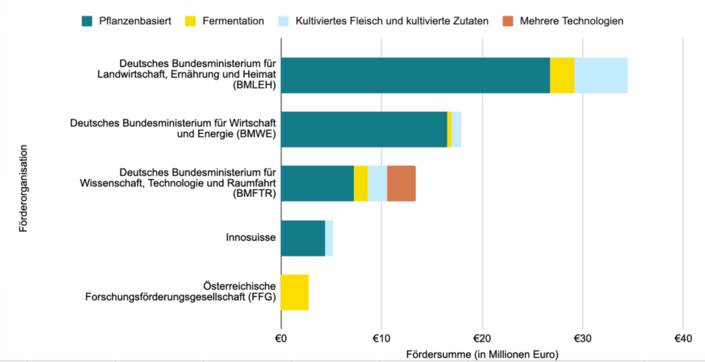 Laut BMELH hat die Bundesregierung seit 2021 insgesamt 111,25 Millionen Euro in den Bereich alternativer Proteine investiert. Dabei ist zu beachten, dass diese Summe auch viele Projekte umfasst, die nicht direkt auf pflanzenbasierte, fermentationsbasierte oder kultivierte Fleisch-, Fisch-, Eier- oder Milchprodukten abzielen. Ein erheblicher Anteil (rund 23 Millionen Euro) floss beispielsweise in Forschung und Entwicklung zu neuen Proteinquellen für die Futtermittelproduktion. Weitere Mittel betrafen die Entwicklung oder den Anbau von Kulturpflanzen ohne konkreten Bezug zu Produkten wie pflanzenbasiertem Fleisch, oder Projekte zur Insektenforschung.