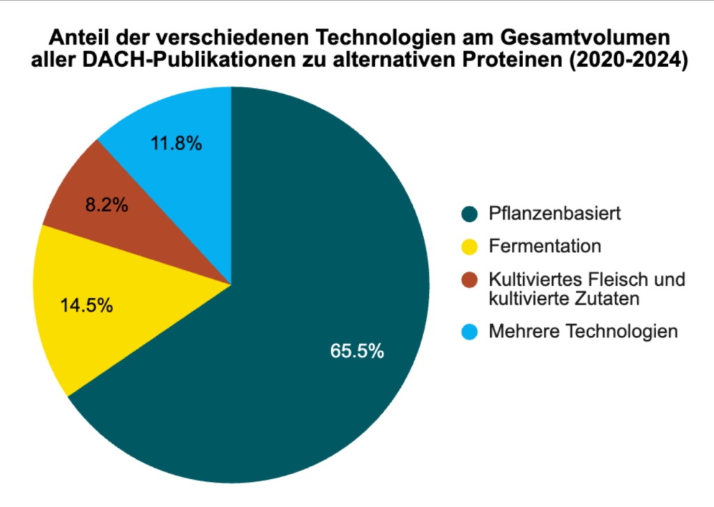 Wie in vielen anderen Regionen ist auch in der DACH-Region die Forschung zu pflanzenbasierten Proteinen derzeit am weitesten entwickelt. Zwischen 2020 und 2024 entfiel über die Hälfte aller wissenschaftlichen Publikationen sowie rund 80 % aller angemeldeten Patente auf pflanzenbasierte Technologien. Einrichtungen wie die Universität Hohenheim, das Fraunhofer-Institut für Verfahrenstechnik und Verpackung (IVV) oder die Technische Universität München zählen zu den aktivsten öffentlichen Forschungseinrichtungen Europas in diesem Bereich.