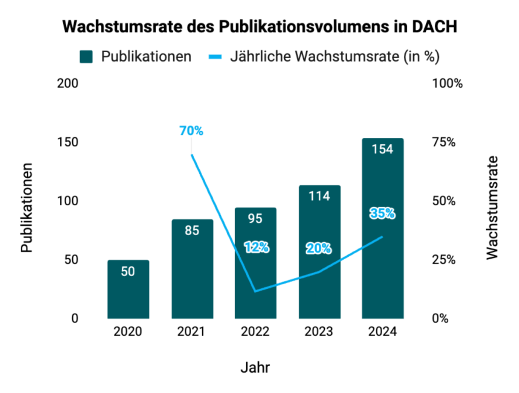 Wissenschaftliche Publikationen wurden zwischen 2020 und 2024 in der DACH-Region vor allem zu pflanzenbasierten Proteinen veröffentlicht. Die Zahl der jährlichen Veröffentlichungen stieg Jahr um Jahr, wobei die Wachstumsrate seit 2023 stark abgenommen hat.