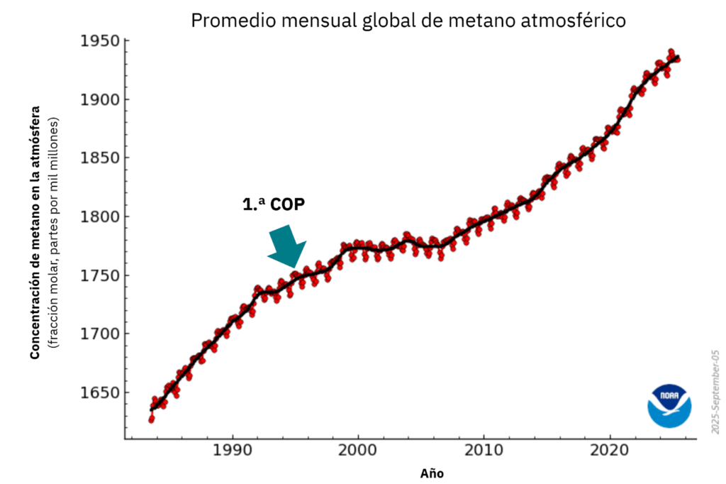 Debido a su alta incidencia en el efecto invernadero, que es en torno a unas 80 veces más alta que la del dióxido de carbono en el corto plazo, reducir las emisiones de metano es esencial para ralentizar la escalada de temperaturas globales. Por ello, llama la atención que en 30 años no se haya abordado en la agenda de las sucesivas COP la causa de en torno a un tercio de las emisiones antropogénicas de metano: la producción de carne convencional.