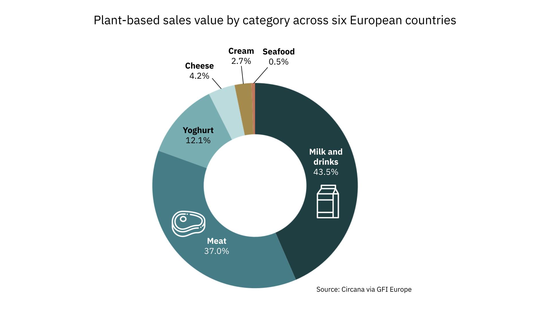 The two largest plant-based categories are milk and drinks, and meat. Across the six countries covered by the Circana data, they accounted for 44% and 37%, respectively, of plant-based sales value in 2024. Across all of Europe, the proportions were similar, at 44% and 34% respectively, according to Euromonitor.