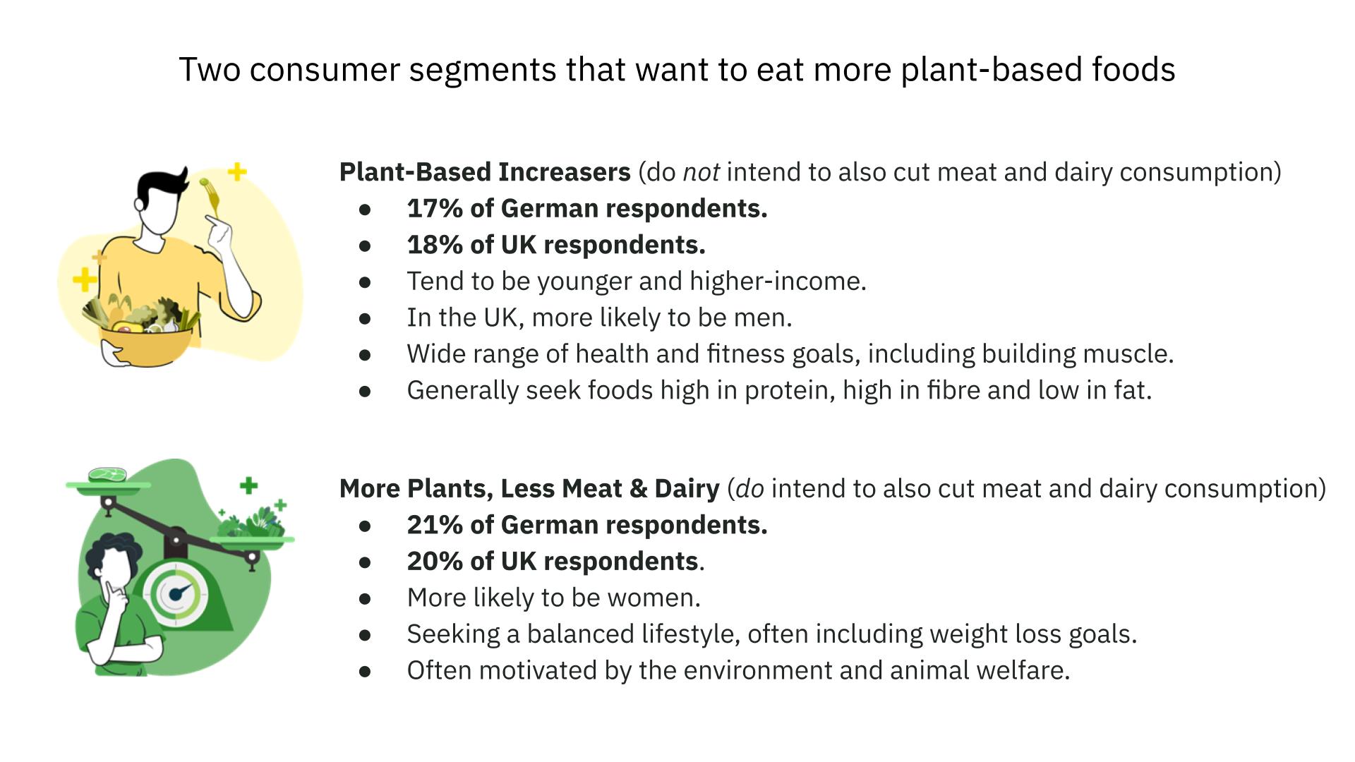 The polling identified two consumer segments who want to eat more plant-based foods in the future. However, they have differing motivations. Those who also want to cut their meat and dairy consumption are often aiming to lose weight, are seeking a healthy lifestyle, or are motivated by the environment and animal welfare. Those who are not simultaneously seeking to cut their meat and dairy consumption are more likely to be driven by fitness goals such as building muscle, and seek foods that are high in protein, high in fibre and low in fat.