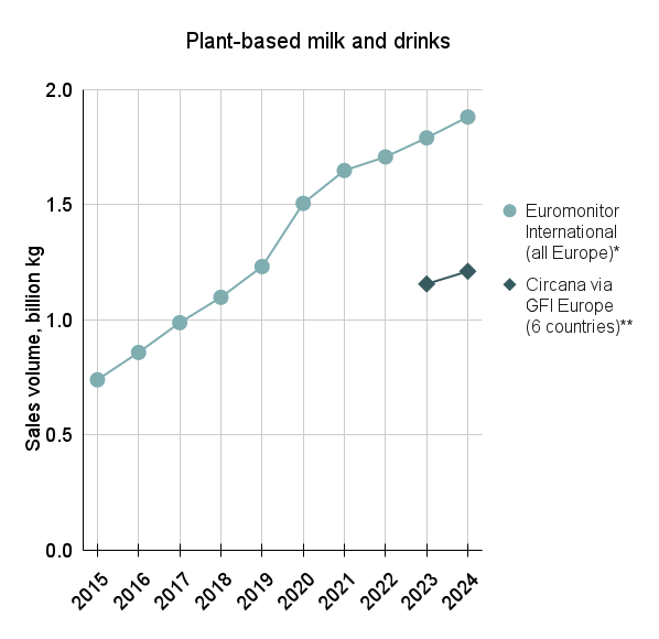 **Retail sales volume of plant-based milk & drinks across 6 countries (France, Germany, Italy, the Netherlands, Spain and the UK). Source: Circana via GFI Europe.