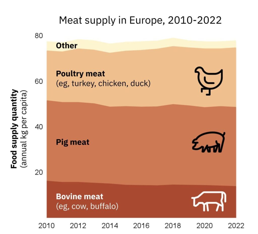 Despite the familiarity of Europeans with alternative proteins and the significant proportion pursuing some degree of meat reduction in their diets, overall supplies of meat across Europe have remained steady over the past decade. While there has been a slight shift away from red meat towards poultry, the overall supply of meat remains approximately 78 kg per person per year.