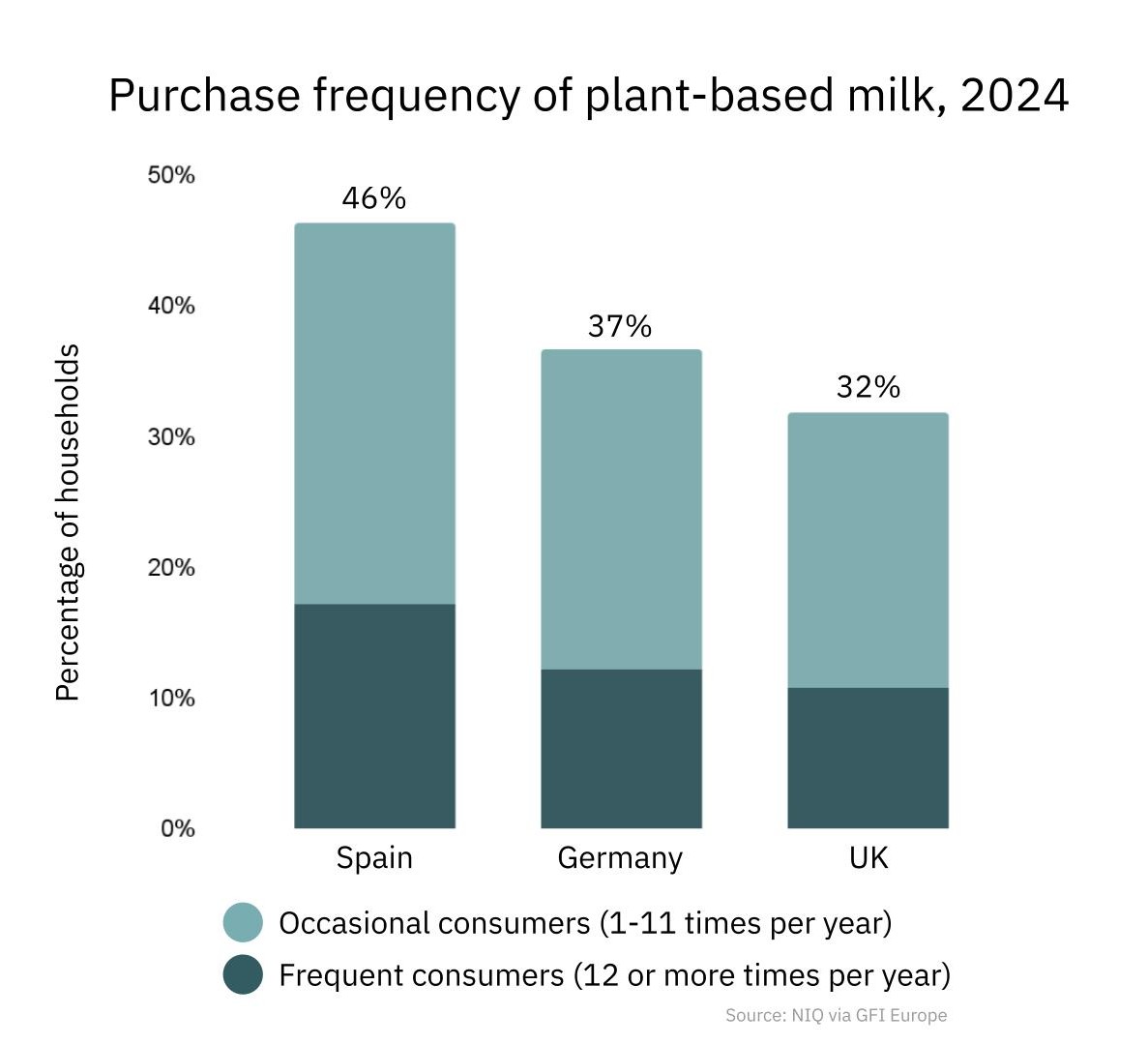 Plant-based milk has gained a wide customer base, being bought at least once by 46% of households in Spain during 2024, 37% of German households and 32% of UK households. A smaller, but still significant, proportion of households were frequent consumers: 17% of households in Spain, 12% in Germany and 11% in the UK bought plant-based milk an average of at least once a month. The popularity of plant-based milk in Spain may be related to relatively high rates of lactose intolerance in southern Europe.