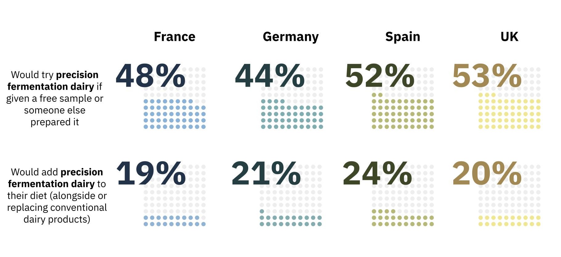 Separately, the EIT Food Consumer Observatory found in 2025 that 43% of respondents across six countries (France, Spain, Italy, Greece, Poland and Denmark) would be willing to try dairy products produced using precision fermentation.