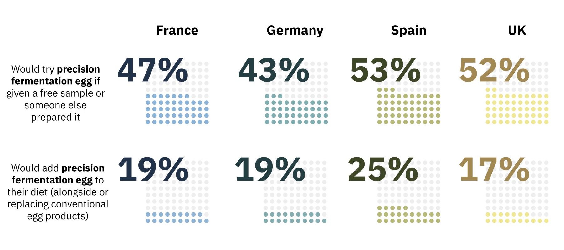 Research published in 2025 by GFI Europe and Accenture found that around half of consumers across four European countries (France, Germany, Spain and the UK) were willing to try dairy and egg products made using precision fermentation if they were given a free sample or someone else prepared it for them. Around one in five would add these products to their diet.